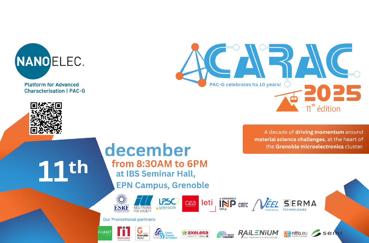 CARAC is the annual event dedicated to advanced characterization techniques for the electronics domain and related fields. The 2025 edition, organised by IRT Nanoelec, features contributions from major European partners, including the European Synchrotron Radiation Facility (ESRF), Institut Laue-Langevin (ILL), CEA-Leti (PFNC), CNRS-LPSC, Néel Institute, CMTC, and SERMA Technologies.