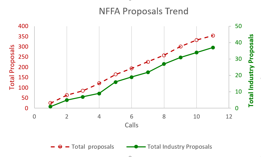 Since the first calls, industry response was in line or better with target (see plot below), leading to 23 accepted proposals involving industry, out of 217 since the beginning of the project in 2016.