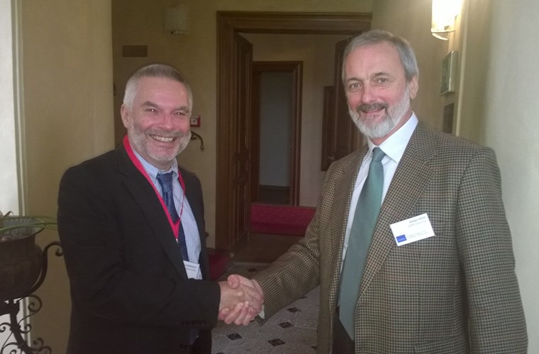 Photo: Handshake between Giorgio Rossi and the outgoing President John Womersely right after the designation.