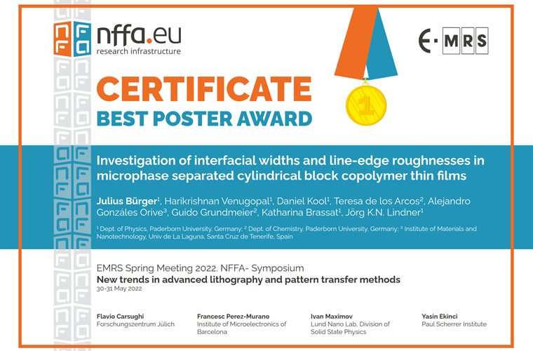 Julius Bürger received the award for his online contribution "Investigation of interfacial widths and line-edge roughnesses in microphase separated cylindrical block copolymer thin films" during the NFFA-Europe Symposium entitled “New Trends in Advanced Lithography and Pattern Transfer Methods”.