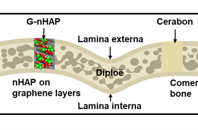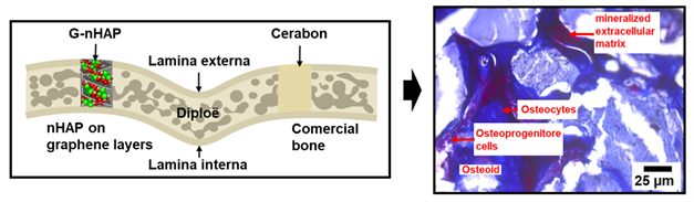 Graphene-nanohydroxyapatite (G-nHAP) filling the skull bone in rats with cerabon as a reference, showing the scaffold lamellar structure, osteoid cells and mineralized extracellular matrix after six weeks.