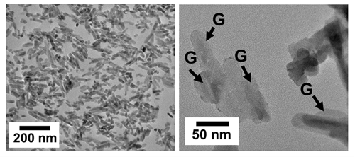 Transmission electron micrographs of the graphene nanohydroxyapatite, showing needle-like structures of nanohydroxyapatite in contact with graphene (G shown by arrows).