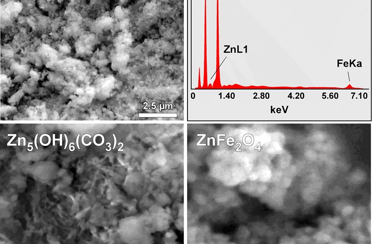 SEM image of the ZnFe2O4/Zn5(OH)6(CO3)2 nanocomposite (Zn/Fe=2.5) and corresponding EDX elemental analysis spectrum. Regions rich in Zn5(OH)6(CO3)2 sheets and ZnFe2O4 nanoparticles.
